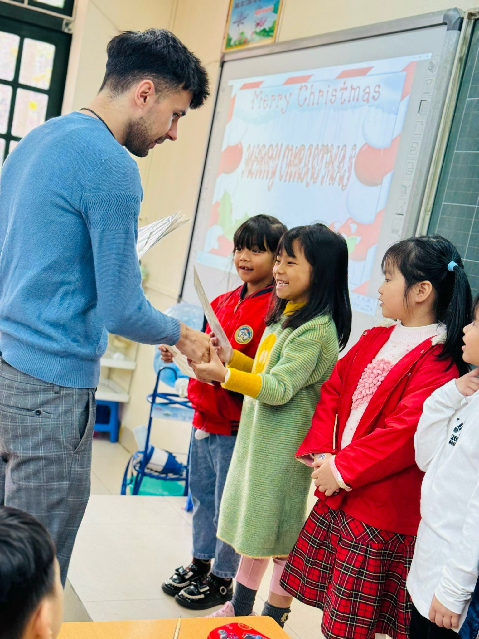 Bé nào cũng háo hức trang trí chuông, thiệp và cây thông. Có bạn còn viết “Merry Christmas, Mom & Dad” đầy xúc động nữa đó! 🥰